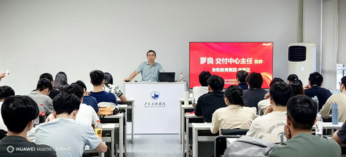 东软教育科技集团华南交付中心主任罗良对我院师生的到来表示热烈欢迎。他介绍了集团的基本情况和发展目标,并表示本次实训将紧密结合当前IT 行业最新需求,为学生配备企业级真实项目案例与专业实战指导团队,切实提升技术应用能力,为未来职业发展打下坚实基础。